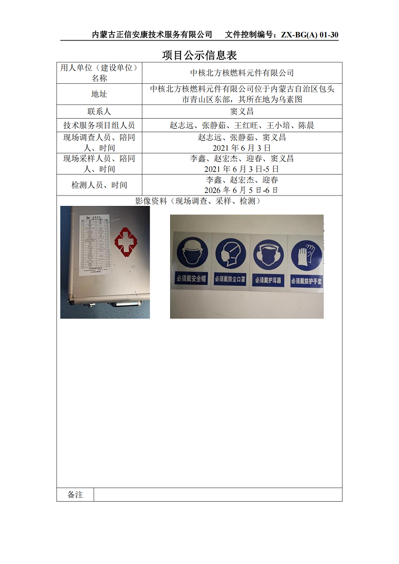 中核北方核燃料元件有限公司鈣質(zhì)品廠安全改造項目職業(yè)病危害控制效果評價報告項目公示信息表
