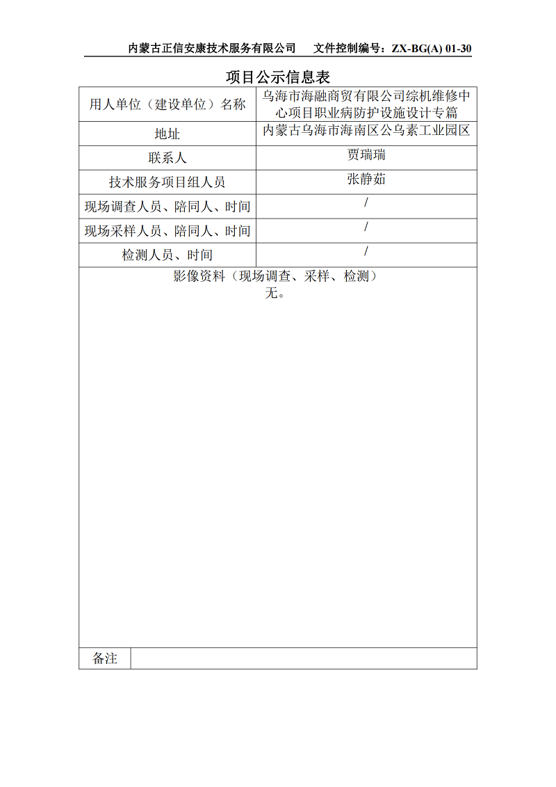 烏海市海融商貿(mào)有限公司綜機維修中心項目職業(yè)病防護設施設計專篇項目信息公示