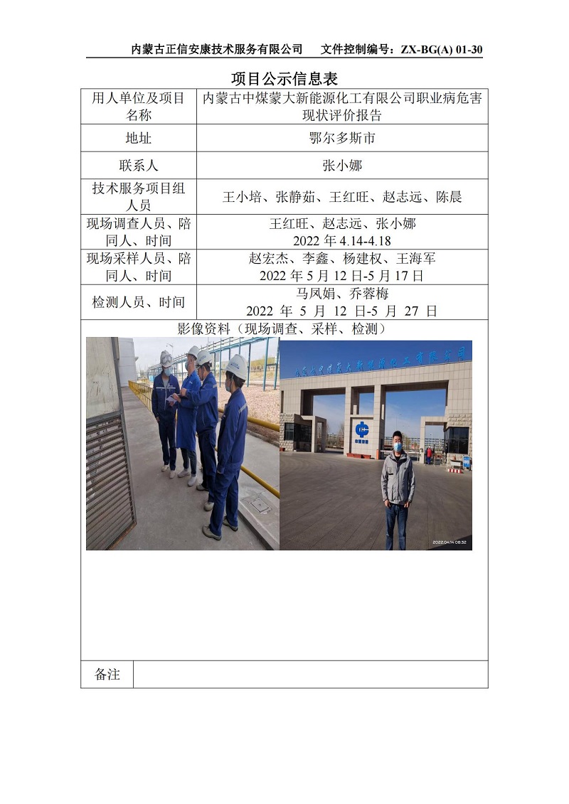 內(nèi)蒙古中煤蒙大新能源化工有限公司職業(yè)病危害現(xiàn)狀評(píng)價(jià)報(bào)告書(shū)公示信息表