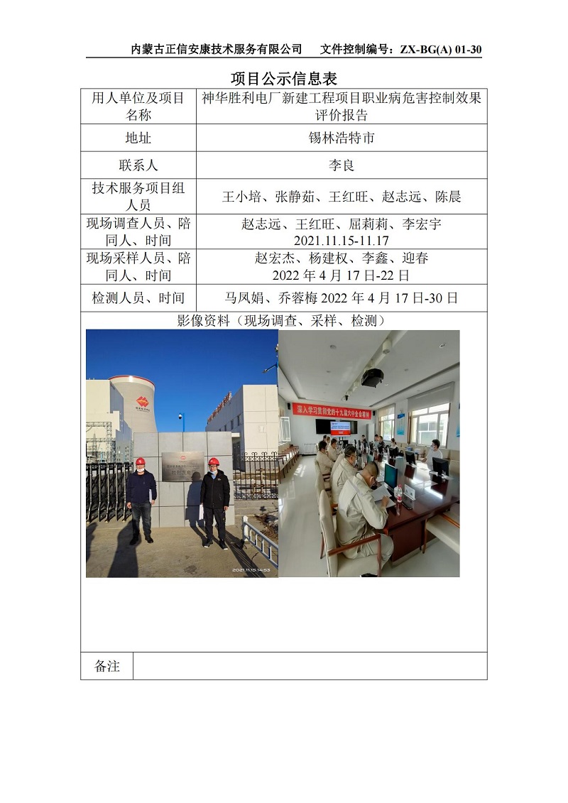 神華勝利電廠新建工程項(xiàng)目職業(yè)病危害控制效果評價(jià)報(bào)告公示信息表