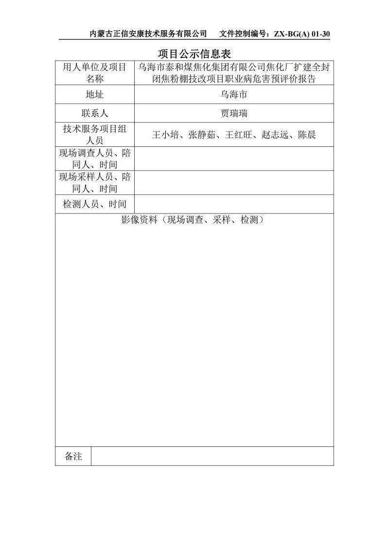 烏海市泰和煤焦化集團有限公司焦化廠擴建全封閉焦粉棚技改項目職業(yè)病危害預(yù)評價報告公示信息表
