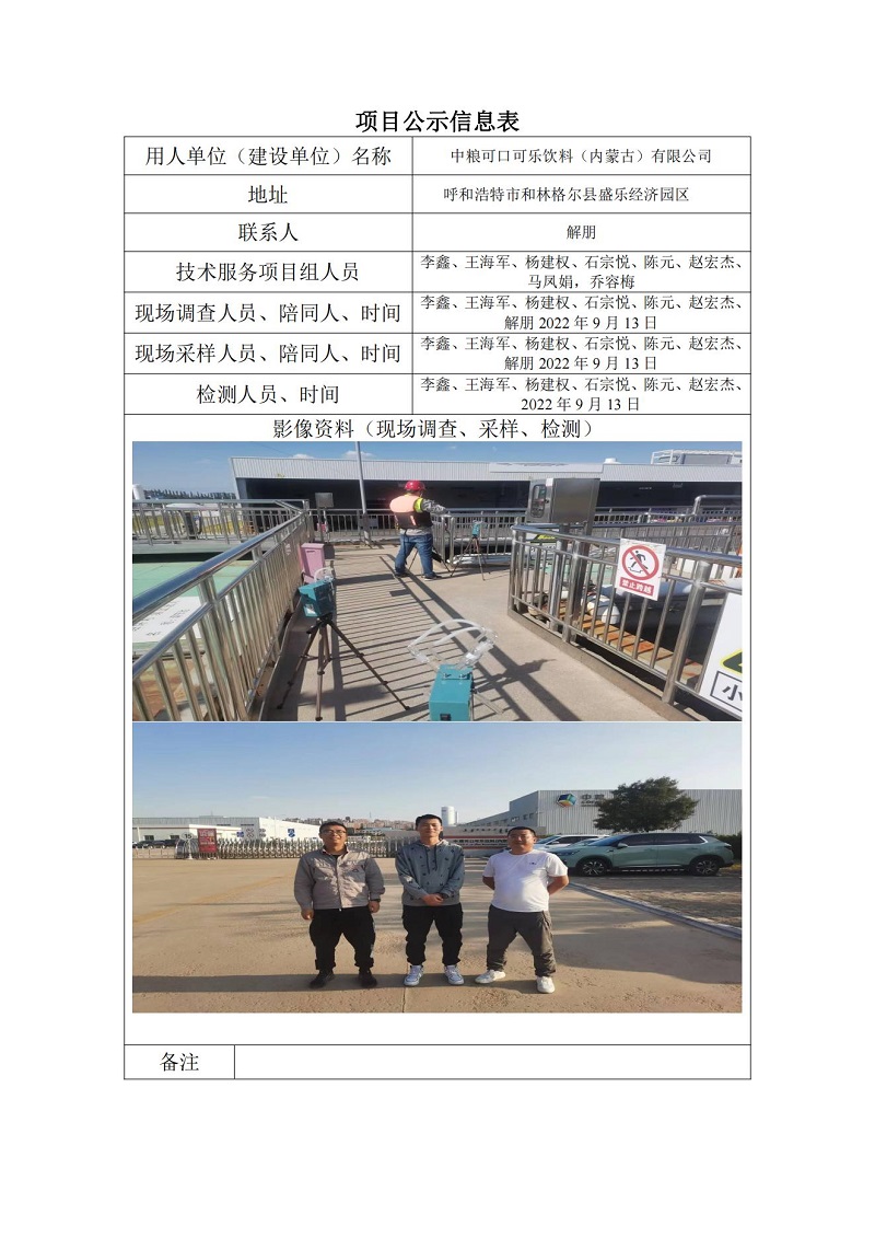 中糧可口可樂飲料(內(nèi)蒙古)有限公司定期檢測項目公示