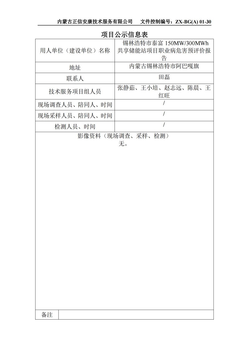 錫林浩特市泰富150MW300MWh共享儲能站項目職業(yè)病危害預(yù)評價公示信息