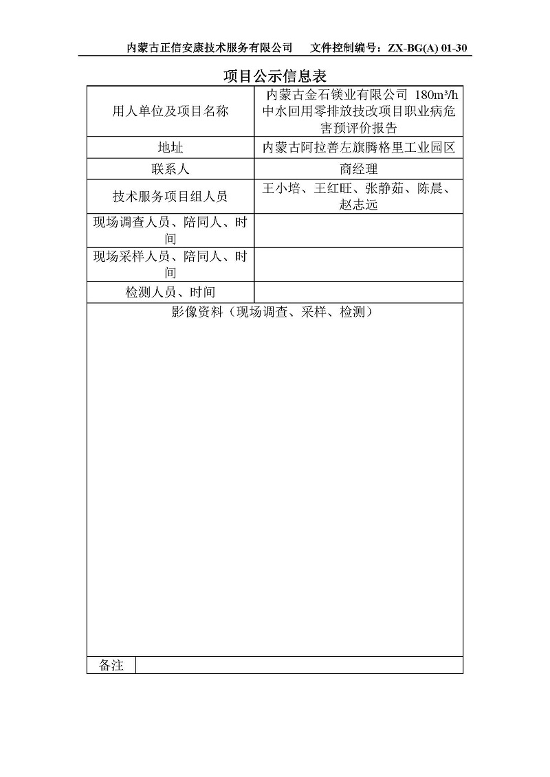 內(nèi)蒙古金石鎂業(yè)有限公司 180m3h中水回用零排放技改項目職業(yè)病危害預(yù)評價報告信息公示表