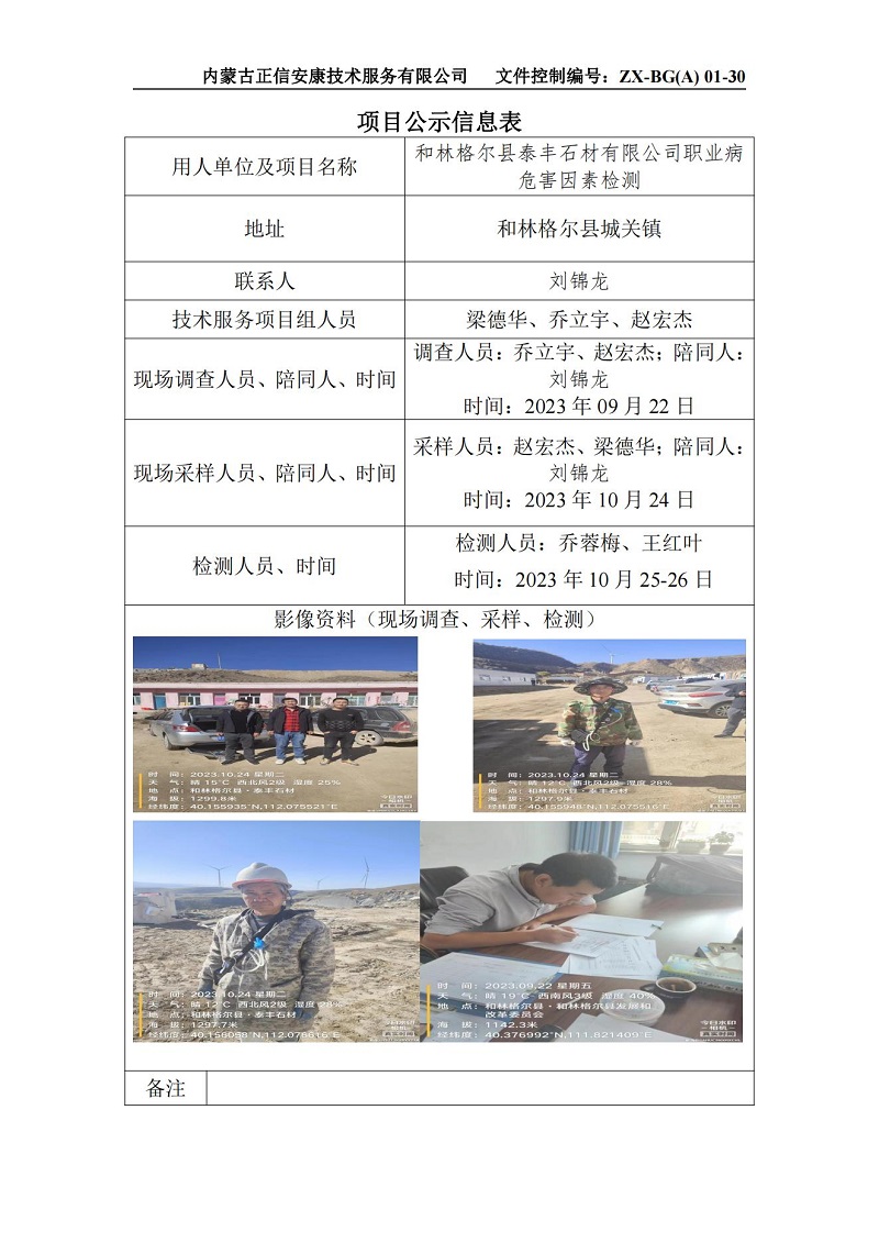 和林格爾縣泰豐石材有限公司職業(yè)病危害因素檢測項目公示信息表