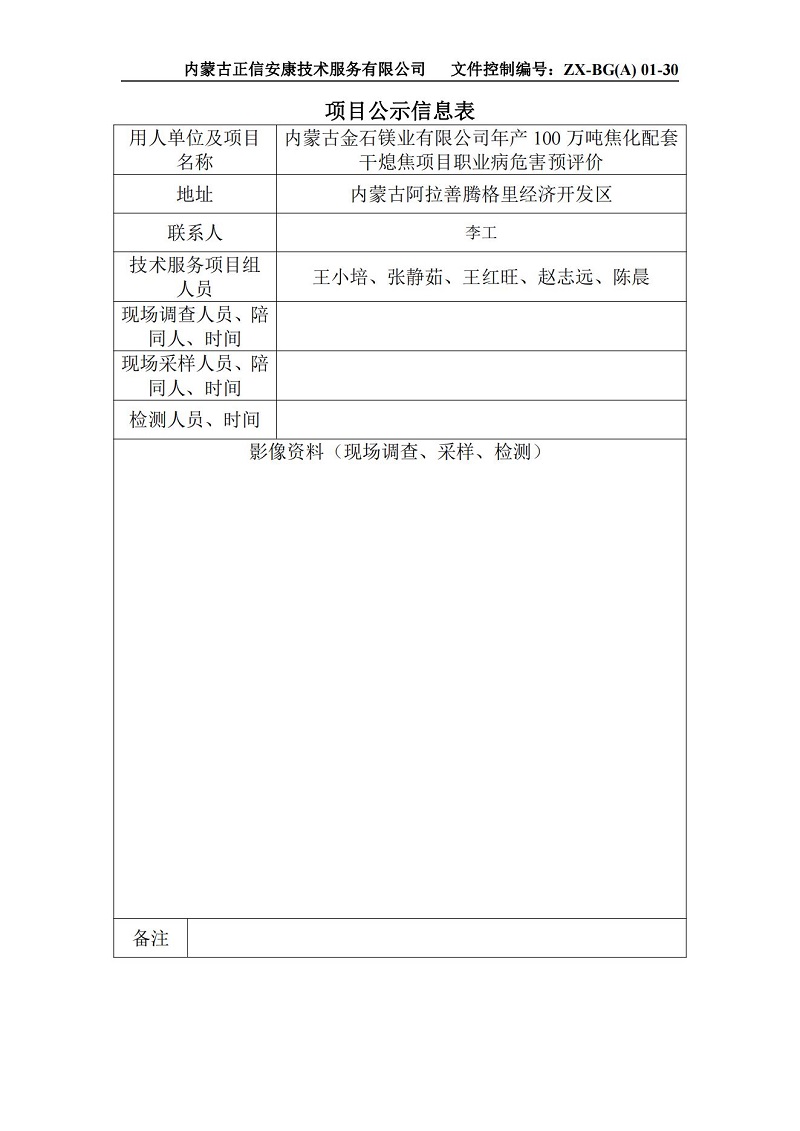 內(nèi)蒙古金石鎂業(yè)有限公司年產(chǎn)100萬噸焦化配套干熄焦項(xiàng)目職業(yè)病危害預(yù)評(píng)價(jià)報(bào)告項(xiàng)目公示信息表