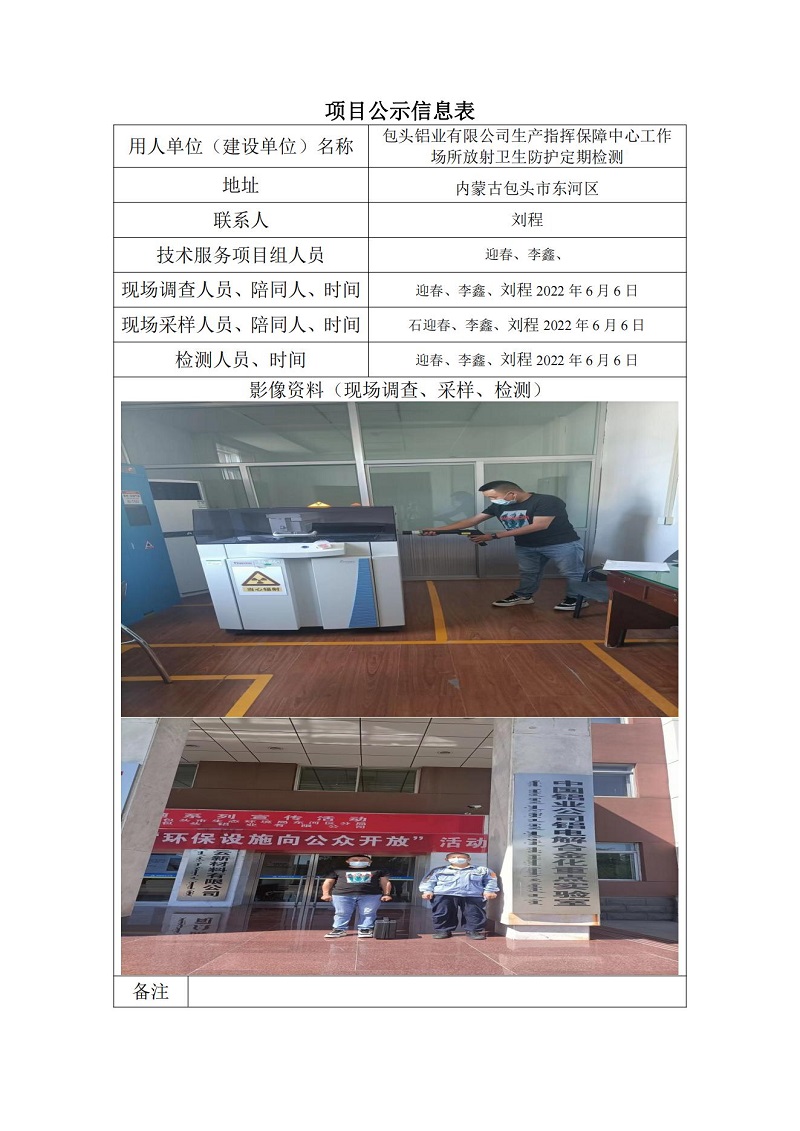 包頭鋁業(yè)有限公司生產(chǎn)指揮保障中心工作場所放射定期檢測項目公示