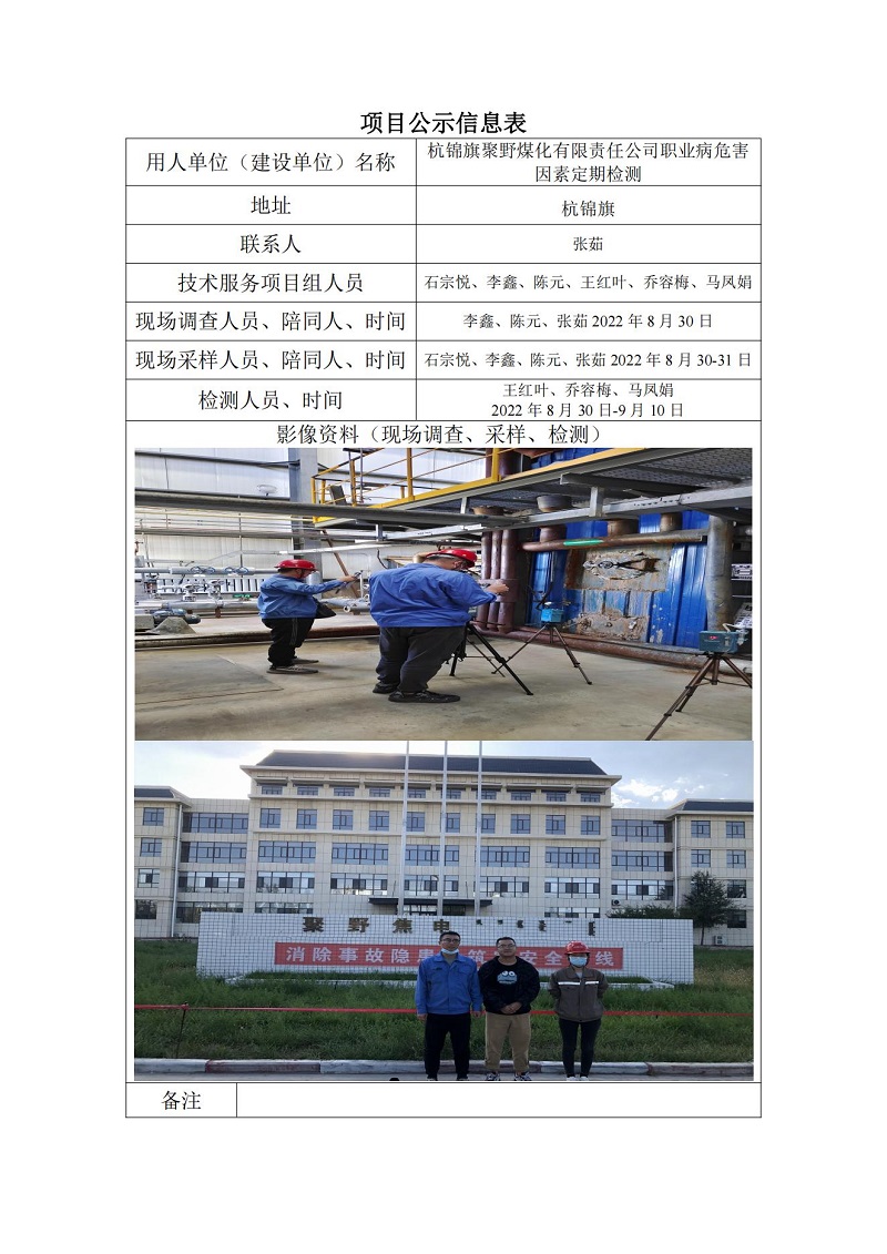 杭錦旗聚野煤化有限責任公司職業(yè)病危害因數(shù)定期檢測項目公示