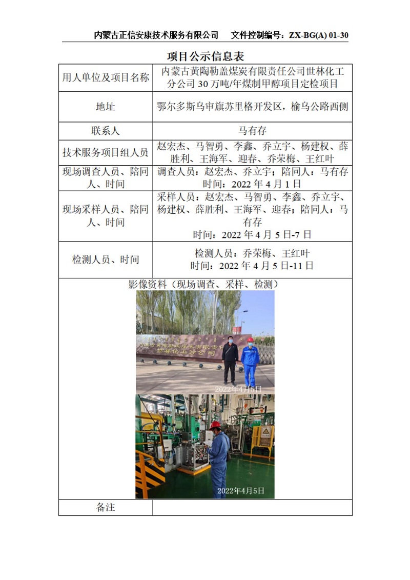 內(nèi)蒙古黃陶勒蓋煤炭有限責(zé)任公司世林化工分公司30萬(wàn)噸年煤制甲醇項(xiàng)目定期檢測(cè)項(xiàng)目公示信息表