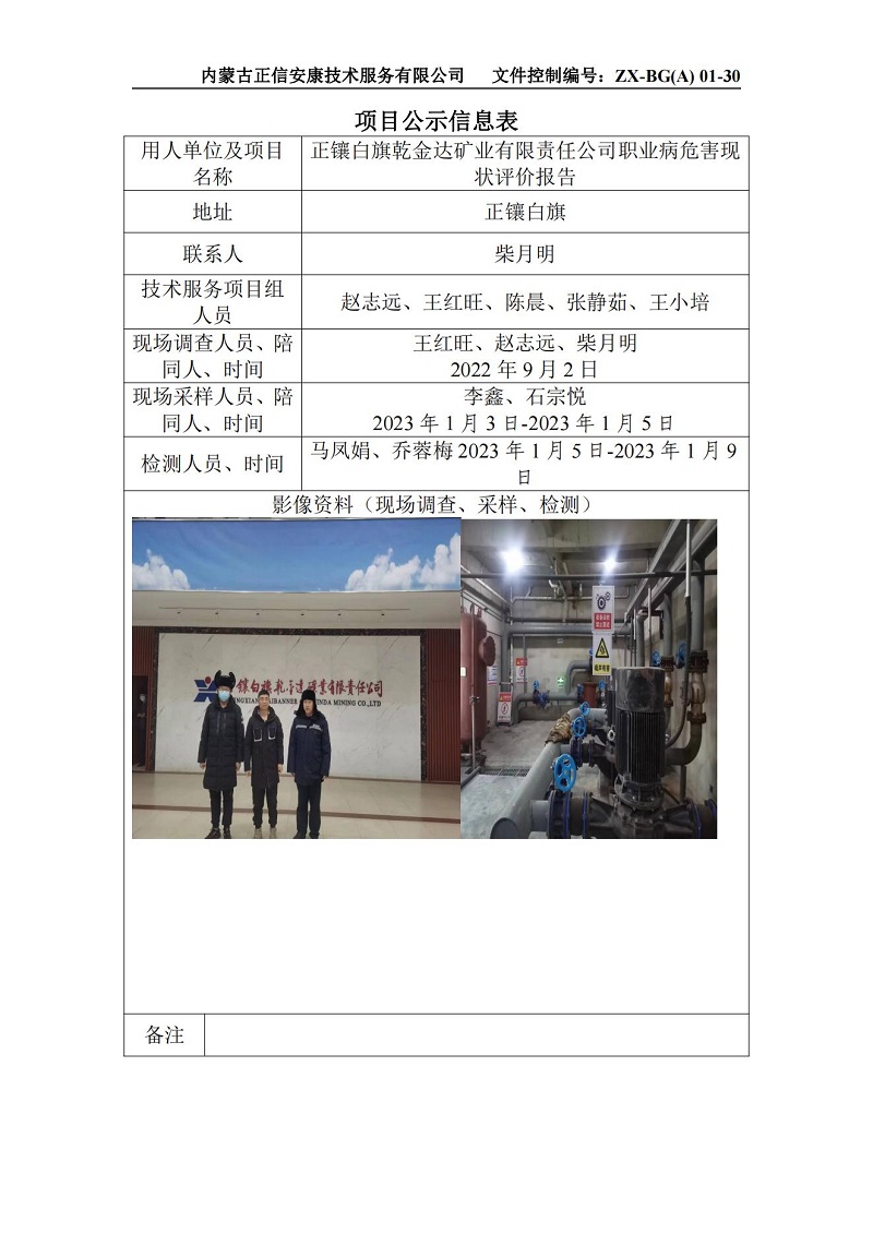 正鑲白旗乾金達礦業(yè)有限責任公司職業(yè)病危害現(xiàn)狀評價報告-項目公示信息表