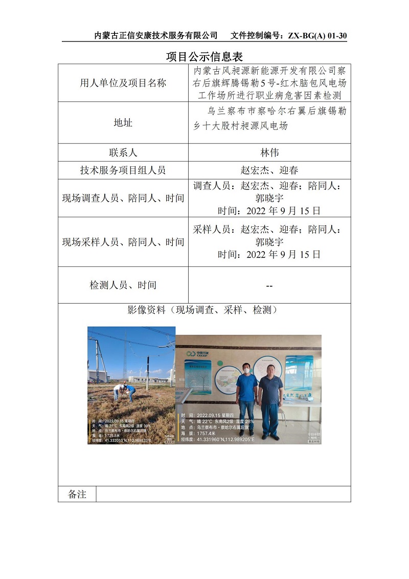 內(nèi)蒙古風(fēng)昶源新能源開發(fā)有限公司察右后旗輝騰錫勒5號-紅木腦包風(fēng)電場工作場所進(jìn)行職業(yè)病危害因素定期檢測