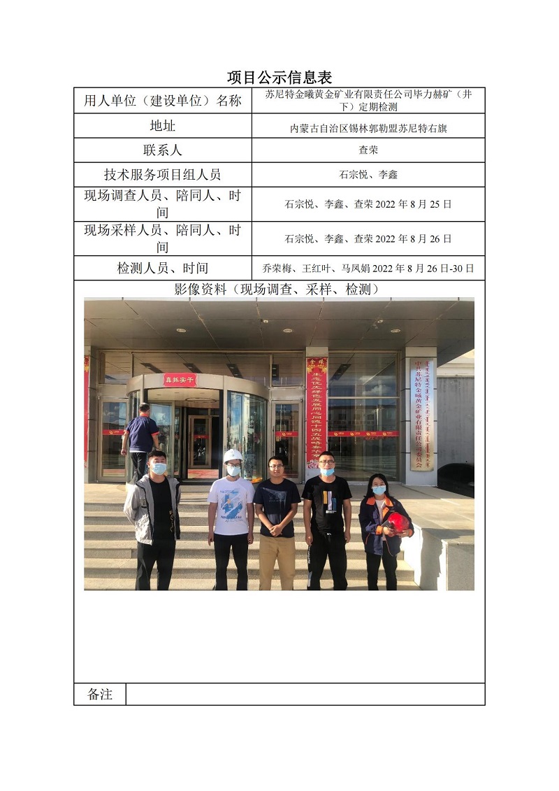 蘇尼特金曦黃金礦業(yè)有限責(zé)任公司畢力赫礦(井下)定期檢測公示信息表
