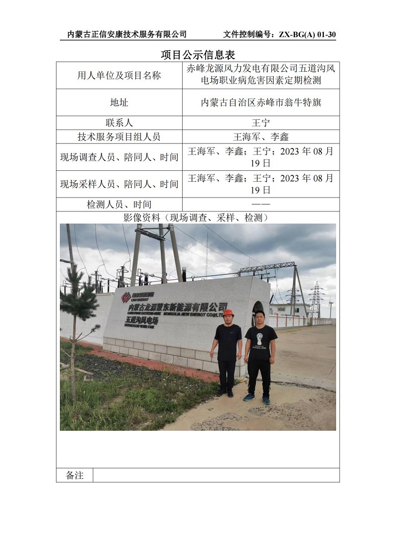 赤峰龍?jiān)达L(fēng)力發(fā)電有限公司五道溝風(fēng)電場職業(yè)病危害因素定期檢測