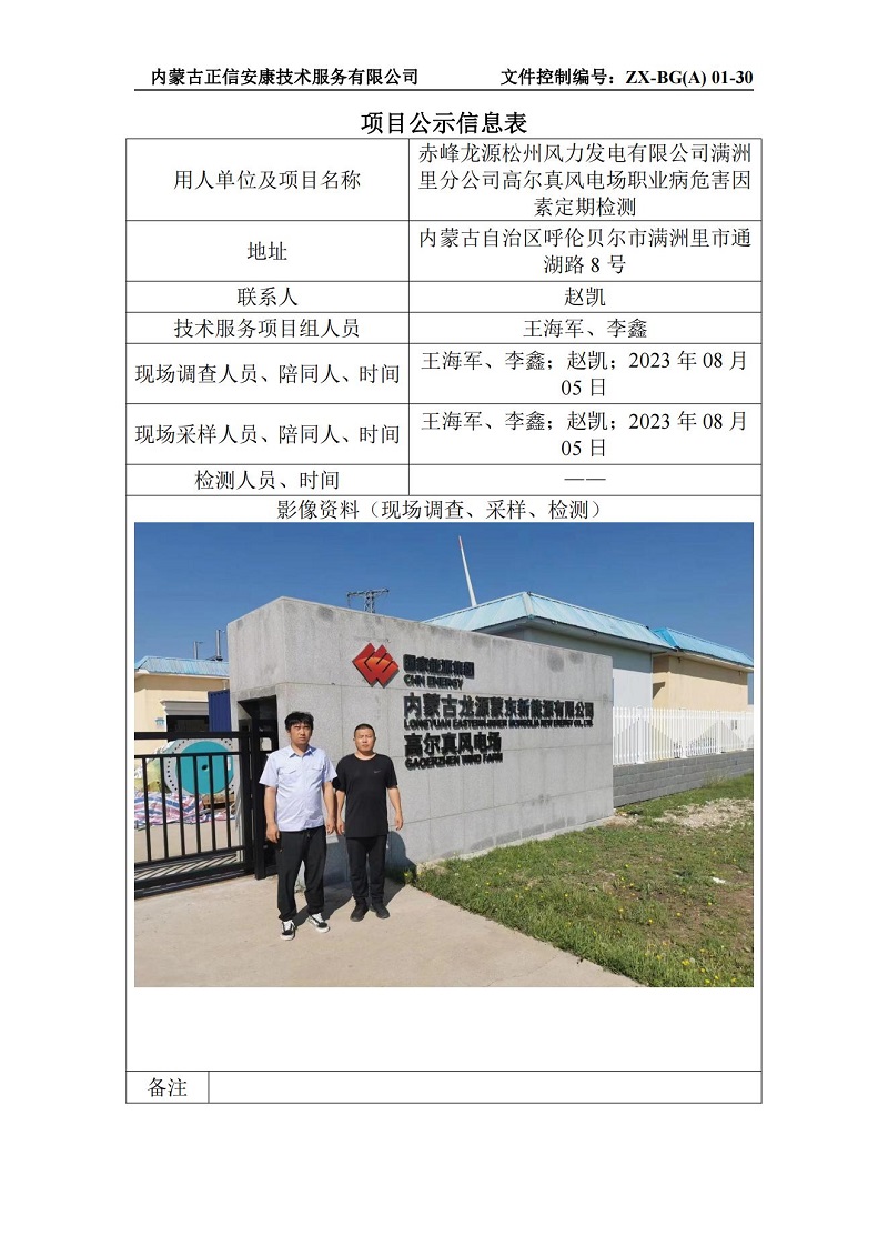 赤峰龍?jiān)此芍蒿L(fēng)力發(fā)電有限公司滿洲里分公司高爾真風(fēng)電場(chǎng)職業(yè)病危害因素定期檢測(cè)
