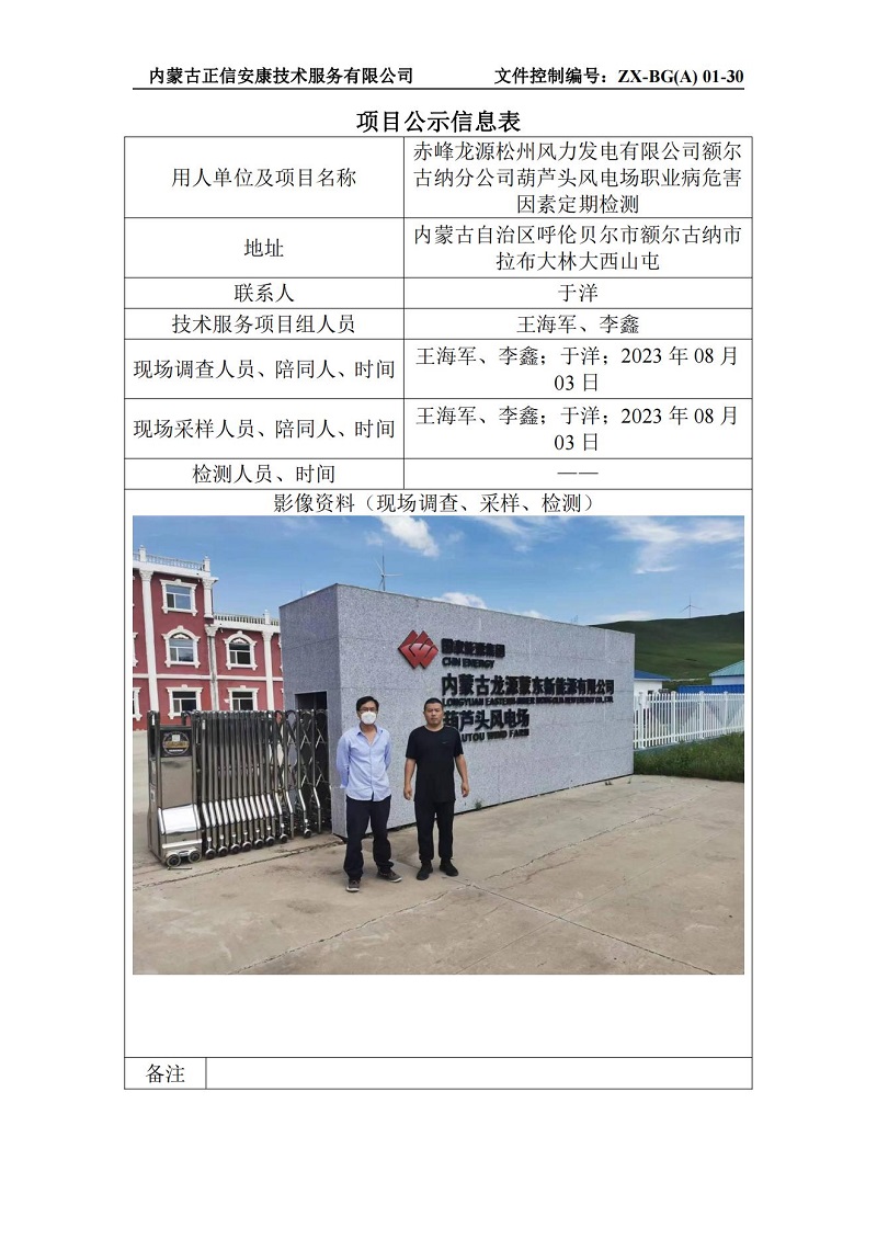 赤峰龍源松州風力發(fā)電有限公司額爾古納分公司葫蘆頭風電場職業(yè)病危害因素定期檢測