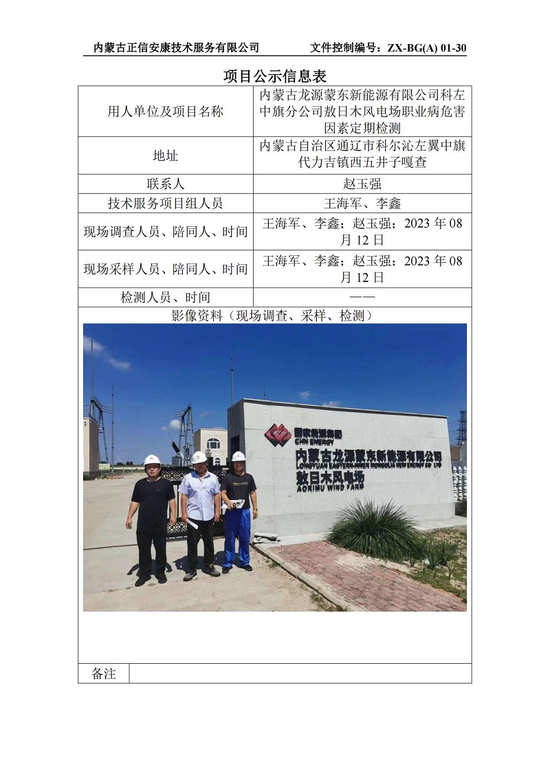內(nèi)蒙古龍?jiān)疵蓶|新能源有限公司科左中旗分公司敖日木風(fēng)電場(chǎng)職業(yè)病危害因素定期檢測(cè)
