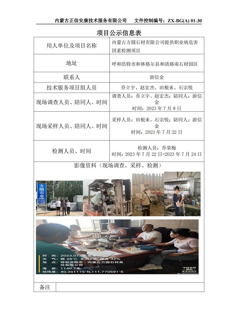內(nèi)蒙古方圓石材有限公司職業(yè)病危害因素檢測項(xiàng)目公示信息表