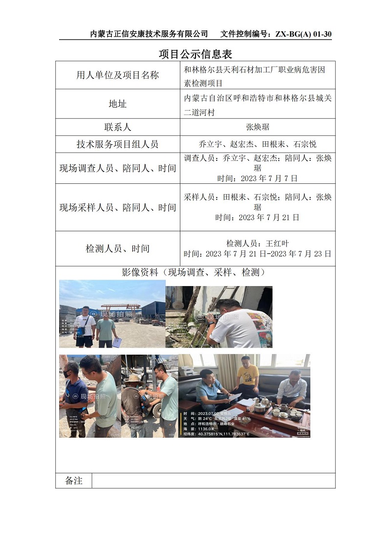 和林格爾縣天利石材加工廠職業(yè)病危害因素檢測項(xiàng)目公示信息表_