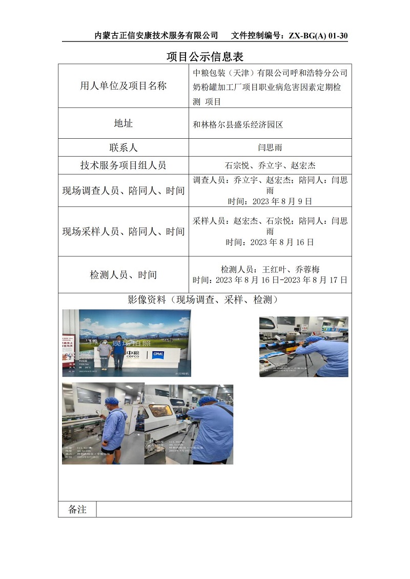 中糧包裝(天津)有限公司呼和浩特分公司奶粉罐加工廠項目職業(yè)病危害因素定期檢測 項目公示信息表