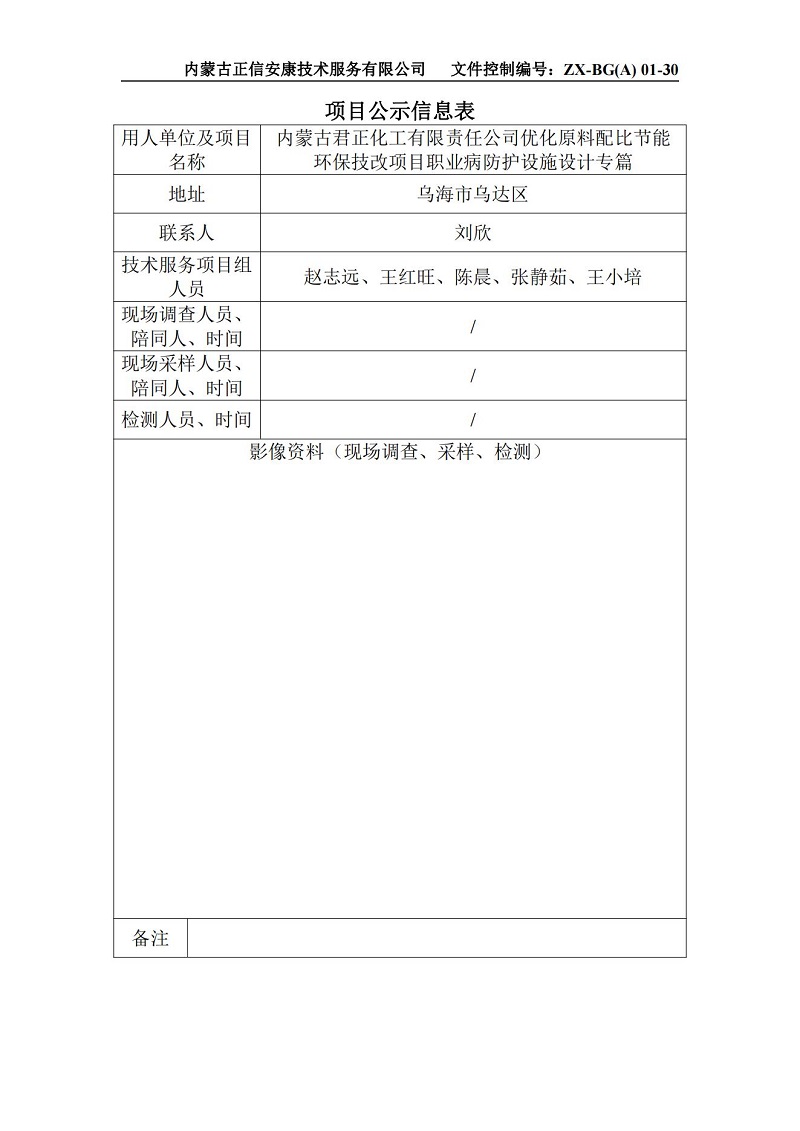 內(nèi)蒙古君正化工有限責(zé)任公司優(yōu)化原料配比節(jié)能環(huán)保技改項(xiàng)目職業(yè)病防護(hù)設(shè)施設(shè)計(jì)專(zhuān)篇-項(xiàng)目公示信息表