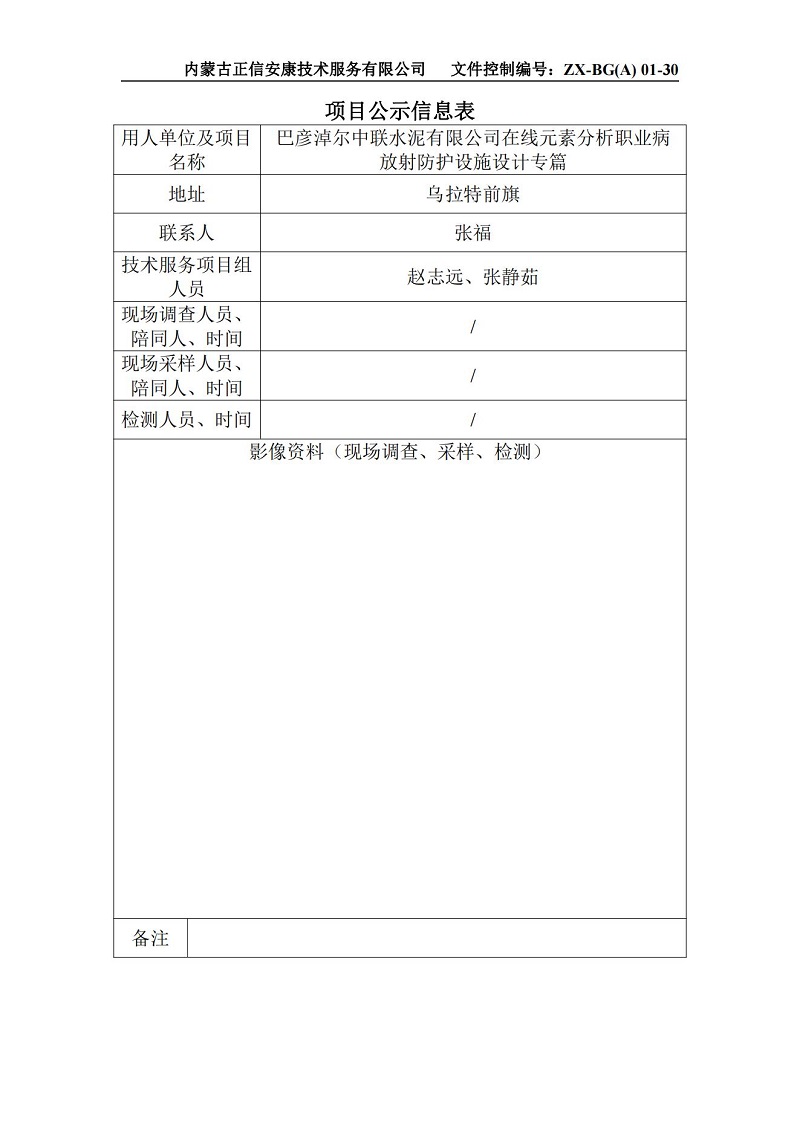 巴彥淖爾中聯(lián)水泥有限公司在線元素分析職業(yè)病放射防護(hù)設(shè)施設(shè)計(jì)專(zhuān)篇-項(xiàng)目公示信息表