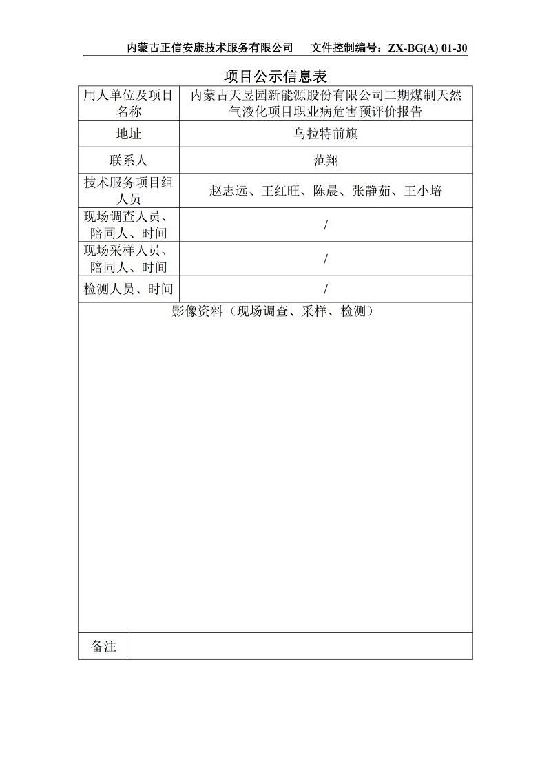 內(nèi)蒙古天昱園新能源股份有限公司二期煤制天然氣液化項(xiàng)目職業(yè)病危害預(yù)評價報告-項(xiàng)目公示信息表