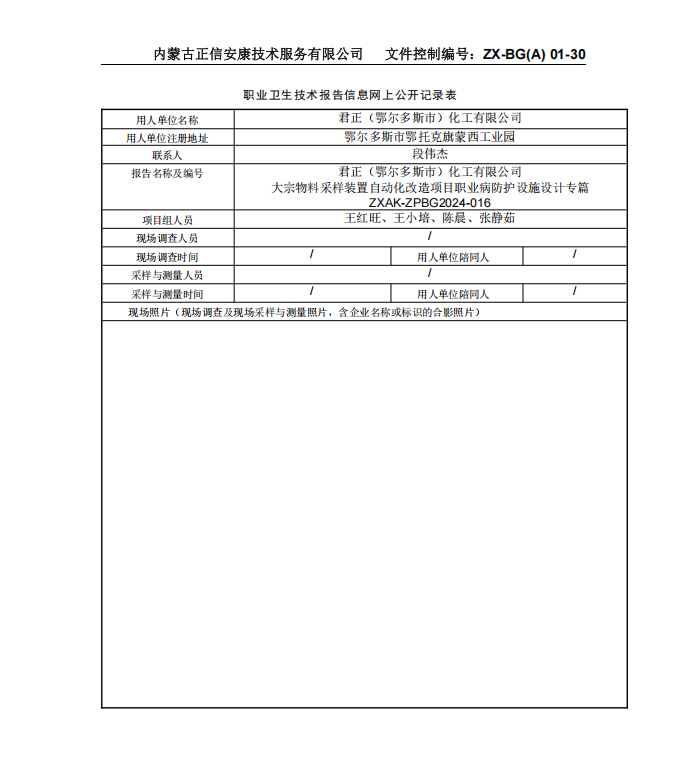 君正(鄂爾多斯市)化工有限公司 大宗物料采樣裝置自動化改造項目職業(yè)病防護設施設計專篇